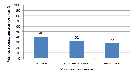 - 32 % (8 чел.) младших дошкольников условно готовы к поступлению в ДОУ;
