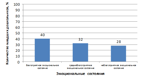 - 40 % (10 чел.) младших дошкольников имеют благоприятное эмоциональное настроение;