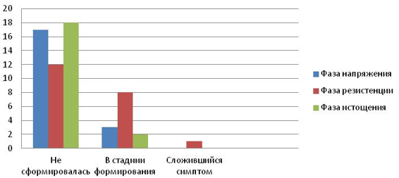 На рисунке 2 представлены наиболее выраженные в своём проявлении фазы эмоционального выгорания. Фаза напряжения диагностирована в стадии формирования у 3 (15%) воспитателей. Фаза резистенции диагностирована в стадии формирования у 8 (40%) воспитателей. У одного воспитателя фаза резистенции диагностирована в стадии сложившегося симптома. Фаза истощения диагностирована в стадии формирования у 2 (10%) воспитателей. Выявлены наиболее часто диагностированные у воспитателей симптомы, к которым относятся: расширении сферы экономии эмоций; эмоциональная дезориентация; неадекватное реагирование и эмоциональный дефицит. Данные симптомы выражаются в неадекватном избирательном эмоциональном реагировании, экономичном проявлении эмоций, использование эмоций ограниченного регистра и умеренной интенсивности, возникновение потребности в самооправдании, отсутствие сопереживания, сочувствия к окружающим.