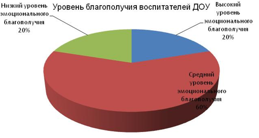 Также был диагностирован уровень эмоционального благополучия воспитателей ДОУ. Получены следующие результаты. Высокий уровень эмоционального благополучия диагностирован у 20% воспитателей, средний уровень благополучия диагностирован у 60% и низкий уровень выраженности эмоционального благополучия диагностирован у 20% воспитателей дошкольного образовательного учреждения. Графически результаты диагностики уровня эмоционального благополучия представлены на рисунке 3.