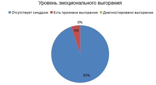 После реализации программы психолого-педагогической коррекции была проведена повторная диагностика по методикам, диагностирующим эмоциональное выгорание. В результате получены следующие данные: у 95% отсутствуют признаки эмоционального выгорания; у 5% диагностированы некоторые признаки эмоционального выгорания. На рисунке 4 графически представлены результаты диагностики уровня эмоционального выгорания у воспитателей дошкольного образовательного учреждения после проведения психолого-педагогической коррекции.