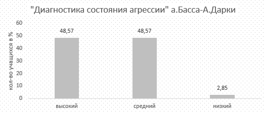 Анализ результатов по рисунку 2 показывает, что 10 младших школьников (28,57%) имеют высокий уровень проявления агрессии, средний уровень имеют 16 детей (45,71%) и низкий уровень – 9 (25,71%). Агрессия в данном случае у детей проявляется ситуативно. В группе исследуемых наиболее выступает «склонность к вербальной агрессии». Можно предположить, что возможными причинами проявления агрессивности могут быть у младших школьников – подчеркивание своего пола и наличие невротической агрессии.