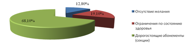 47 человек, не занимающихся спортом, объясняют данный факт следующими показателями: отсутствует желание – 6 (12,8%), не позволяет состояние здоровья – 9 (19,1%), дорогостоящая оплата абонемента либо секций (спортивных занятий) – 32 (68,1%).