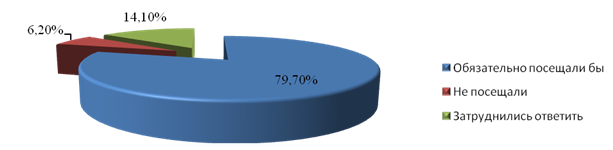 Из всего количества опрошенных людей 102 человека с удовольствием посещали бы данную площадку (79,7%), не посещали бы – 8 человек (6,2%), затруднились ответить – 18 человек (14,1%).