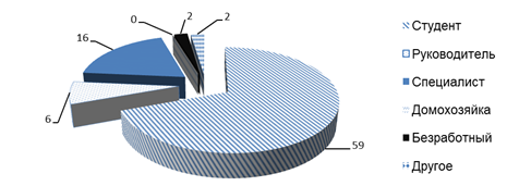 Из данных рисунка 1 видно, что большинство респондентов определили свой род занятий как «студент» (59 человек), на втором месте «специалист» – (16 человек), затем «руководитель» (6 человек), «безработный» (2 человека), 2 человека определили свой статус как «другой».