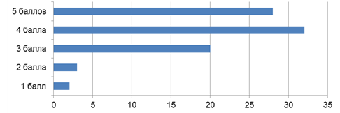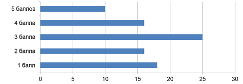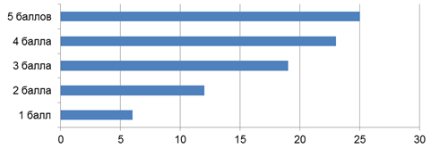 Из данных рисунка 3 видно, что 5 баллов поставили 25 человек (29.4%), 4 балла присвоили 23 респондента (27,1%), 3 балла – 19 человек (24,4%), 2 балла – 12,8%, 1 балл – 6,4%. Средняя оценка степени согласия опрашиваемых с предложенным утверждением составила 3,6 балла.