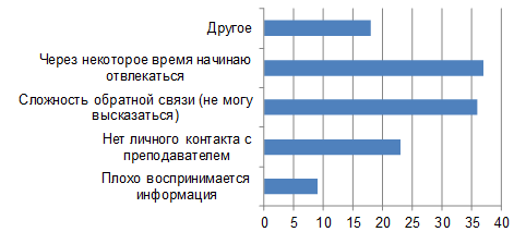 Как видно из рисунка 5, ответ «через некоторое время начинаю отвлекаться» выбрали 37 человек или 44%; «сложность обратной связи (не могу высказаться)» – 36 человек или 42,9%; «нет личного контакта с преподавателем» – 23 человека или 27,4%; «плохо воспринимается информация» – 9 человек или 10,7%. Некоторые респонденты отмечали ответ «Другое» (18 человек или 21,4%). Среди предложенных опрашиваемыми вариантов ответов на данный вопрос можно отметить ответы, связанные с техническими аспектами проведения вебинаров: