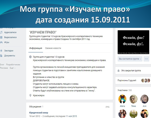 Созданная группа «Изучаем право!» позволяет многим родителям успешно осуществлять контроль за образовательным процессом своего ребенком.