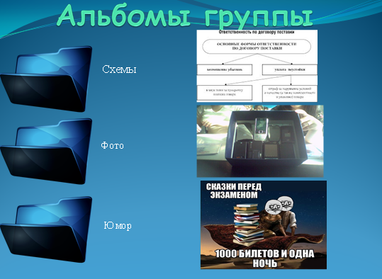 В группе «Изучаем право!» на стене в настоящее время размещается информация для студентов очного и заочного отделений по тем дисциплинам, по которым осуществляется педагогическая деятельность автора, что включает в себя: (см.рис.2)