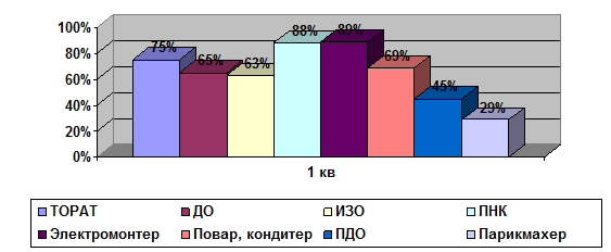 По данным мониторинга трудоустройства выпускников за последние три года (рис.) самыми востребованными специальностями и профессиями на рынке труда являются «Преподавание в начальных классах» (88% профильного трудоустройства), «Электромонтер по ремонту и обслуживанию электрооборудования» (89% профильного трудоустройства), «Техническое обслуживание и ремонт автомобильного транспорта» (75% профильного трудоустройства), «Повар, кондитер» (69% профильного трудоустройства), «Дошкольное образование» (65% профильного трудоустройства).