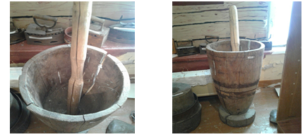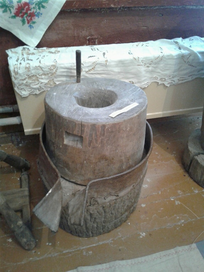 Ступа с пестом. Приспособление для изготовления круп из неочищенных зерен пшеницы, ячменя, проса, гречихи. Предназначенные для этой цели ступы выдалбливались из дерева. Их высота достигала 80 см, глубина — 50 см, диаметр — 40 см. Деревянный пест изготавливался до 100 см длины при диаметре около 7 см. При толчении в ступе зерно освобождается от оболочки и частично размельчается. Ступы были в каждом крестьянском доме. Ими пользовались по мере надобности, заготавливая крупу на одну, две недели.