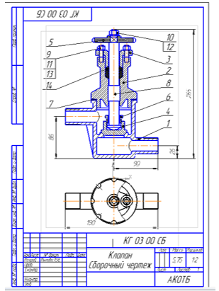 5) Завершается выполнение сборочного чертежа: редактируется чертеж, чтобы он выглядел так, как показано на рисунке 1. Сборочный чертеж Клапана представлен на рисунке 14.