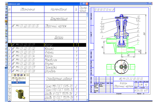 Спецификация создается в полуавтоматическом режиме с увязкой всей информации о сборочном изделии. Передача объектов спецификации из модели в чертеж и спецификацию возможна благодаря возникновению ассоциативных связей между этими документами.