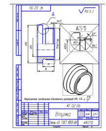 7) Пользуясь обычными приемами КОМПАС-График, завершаем выполнение рабочего чертежа Втулки в соответствии с требованиями ЕСКД. Наносим осевую линию. Проставляем размеры и их предельные отклонения. Наносим шероховатость поверхности. Компонуем положение изображений Втулки на чертеже. Вносим технические требования. Заполняем основную надпись. Изменяем масштаб чертежа на 2,5:1. В основную надпись системой автоматически будут занесены обозначение, наименование, материал детали, количество листов. Рабочий чертеж Втулки готов (рисунок 10)