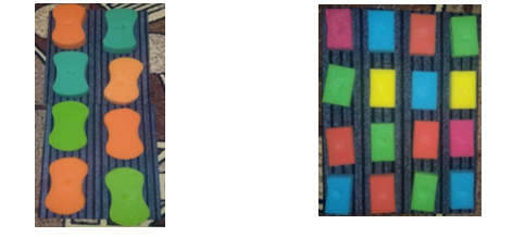 Детям нравится подбирать губки для дорожек или ковриков по форме, цвету, величине, раскладывать их на дорожках, подсчитывая сколько губок понадобится. Они любят выкладывать из губок узоры, чередуя из по цвету и направлению. А потом с гордостью говорят: «Мы сами сделали дорожку для закаливания».