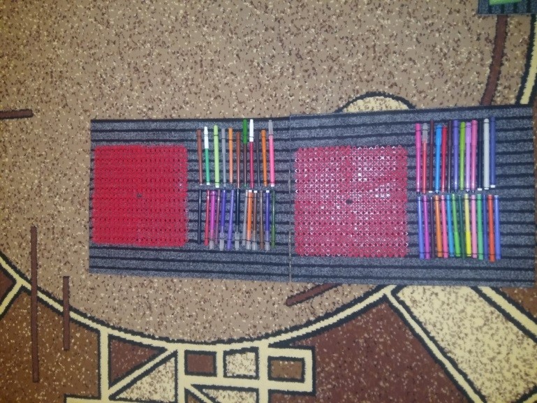 - Комплексный массажный коврик. Коврик оформлен подручными средствами использованные фломастеры, резиновые квадраты, крышки, камешки и т.д.). Такой коврик укрепляет мышцы и связки голени и стопы, способствует правильной работе внутренних органов путем массирования активных точек стопы, а также дарит детям необычные ощущения.