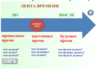 2) Предлагает прочитать слова на доске и сформулировать возможные варианты заданий с ними. Дуть, писать, играть, время, светит, таял. 3) Актуализирует знания по теме «Глагол», демонстрируя кластер (составленный на предыдущих уроках). 4) Просит проанализировать кластер и предлагает сформулировать варианты его дополнения. 5) Организует работу с лентой времени, с целью уточнить понятие «времени» относительно событий, происходящих в момент речи (до, после). Организует работу с толковым словарём С.И. Ожегова 6) Предлагает сформулировать вывод |