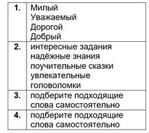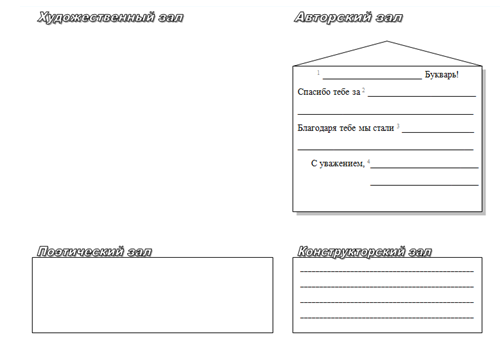 авторский зал Руководитель зала: - Ребята, мы закончили изучать Букварь. Он нас многому научил. Давайте напишем письмо, в котором поблагодарим Букварь за знания и умения. Вам необходимо дописать предложения, используя слова-помощники [Приложение 4] или подбирая слова самостоятельно. Слова, которые вам можно добавить в первое предложение, в карточке записаны под цифрой 1. Желаю, чтобы ваше письмо получилось интересным! |