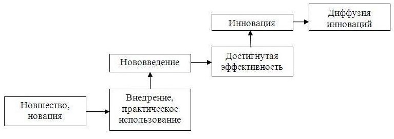 На данном этапе исследования авторы придерживаются мнения, что между терминами «новшество», «новация», «инновация» и «нововведение» есть различия. Новшество может быть представлено в виде открытия, изобретения, патента, ноу-хау. Главное в процессе разработки новшества это его коммерциализация. «Внедрить новшество – значит превратить его в форму инновации, т.е. завершить инновационную деятельность и получить положительный результат».[4] Новшество возможно рассматривать как потенциальную инновацию. Но в тоже время без массового внедрения на рынок и достижения эффективности новшество не станет инновацией. По мнению авторов, недостигнутая эффективность и диффузия инноваций позволяет разграничивать понятия «нововведение» и «инновация». Наглядно процесс перехода термина из одного состояния в другое представлен на рис. 1.