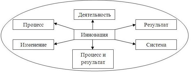 Коллектив авторов под редакцией А.И. Афоничкина считает, что есть «два наиболее распространенные подхода к трактовке основных положений теории нововведений». Первый подход характеризует нововведения с помощью понятия о новых факторах, второй базируется на новой технологии и/или продукции[7]. По их мнению, развитие первого подхода отражается в работах Х. Барнета, П.Т. Ла Пьерре, Л. Водачек, П. Витфилда, О. Водачковой, К. Найта. Второй подход основан на научно-технических позициях, отражающих их значение и цели в общественном развитии. «При этом само понятие «инновация» понимается и как процесс, и как результат». Процессного подхода к пониманию термина «инновации» в своих трудах придерживаются такие ученые, как А. Харман, Р. Джонсон, Б. Санто, П. Лемерль, Т. Брайтон, Ф. Никсон, Л.С. Бляхман, Ю.П. Морозов. Результативный подход прослеживается в трудах Н.К. Моисеевой, Ю.П. Анискина, Г.Я. Кипермана, Д.В. Соколова, А.Б. Титова, М.М. Шибановой, А.Н. Фоломьева, Э.А. Гейгера. Основные подходы к определению термина «инновация» в зарубежных исследованиях могут быть сгруппированы по следующим направлениям: 1) как любое изменение; 2) как результат; 3) как процесс; 4) как средство.