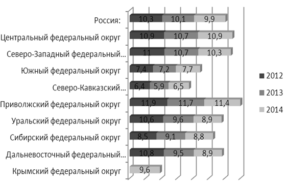 Рис. 1 . Инновационная активность организаций по федеральным округам РФ: 2012-2014 гг.