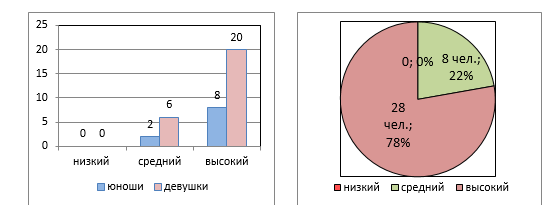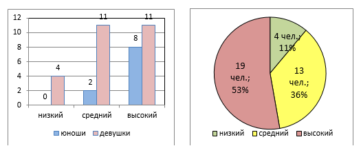 Наряду с этим абсолютное большинство юношей и большая часть девушек показали средний и высокий уровни адаптированности к учебной деятельности. Эти студенты легко осваивают учебные дисциплины, успешно и в срок выполняют учебные задания, при необходимости могут обратиться к преподавателю. Кроме того, они более-менее свободно выражают свои мысли, могут проявить индивидуальность и способности (рисунок 3).