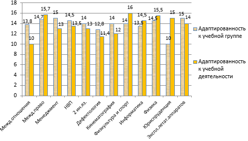 Из рисунка видно, что наименьший уровень адаптированности к учебной группе выявлен у студентов-юристов (10 баллов) и дефектологов (12,8 баллов), а лучше всех адаптировались студенты-физкультурники (16 баллов), будущие пилоты и менеджеры (15 баллов).