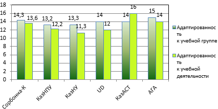 По результатам анализа показателей по вузам выявлено, что самый низкий уровень адаптированности к учебной группе показали студенты КазНПУ и КазНУ (менее 13,5 баллов), а самый высокий уровень показали будущие пилоты (15 баллов). К учебной деятельности лучше всех адаптировались также будущие пилоты и студенты-физкультурники (15 и 16 баллов соответственно).