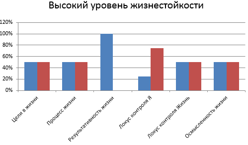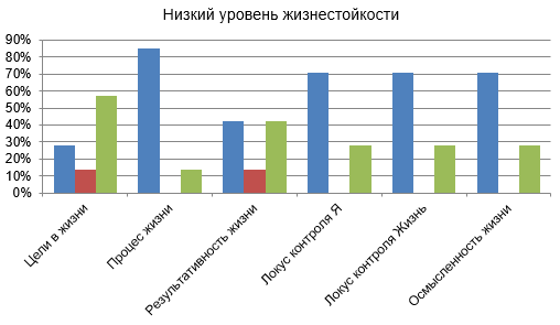 Так же, никто из испытуемых не получил высокий балл по шкале «Локус контроля Жизнь» то есть, испытуемые считают, что их жизнь зависит исключительно от внешних обстоятельств и никто из испытуемых с низким уровнем жизнестойкости не получил высокий балл по шкале «Осмысленность жизни». У таких людей отсутствует интерес к жизни, к будущему, они ни к чему не стремятся и ничего не хотят добиваться.