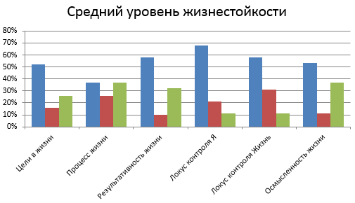 На рисунке 2 представлены особенности смысложизненных ориентаций студентов-психологов со средним уровнем жизнестойкости. 51 % испытуемых имеют средний показатель по шкале «Цели в жизни». Это говорит о том, что люди не имеют конкретных целей, либо имеют, но ещё не знают, каким образом их можно достичь. По шкале «Процесс жизни» 38% испытуемых имеют средний показатель по данной шкале и 38% имеют низкий показатель по данной шкале, что может свидетельствовать о недостаточной удовлетворённости происходящими событиями жизни. По шкале «Результативность жизни» 59 % испытуемых со средним уровнем жизнестойкости имеют средний балл. Этих людей будет характеризовать удовлетворённость прожитой части жизни. 68 % испытуемых имеют средний балл по шкале «Локус контроля Я», это означает, что эти испытуемые чувствуют, что сами могут повлиять на свою жизнь, события, происходящие в жизни иногда можно изменить при помощи собственных усилий. По шкале «Локус контроля Жизнь» 59 % испытуемых получили средние баллы, что говорит об уверенности того, что собственную жизнь можно контролировать и 53% испытуемых получили средние баллы по шкале «Осмысленность жизни». Этих людей будет характеризовать интерес к своей жизни, готовность изучать что- то новое и пробовать себя в различных видах деятельности.