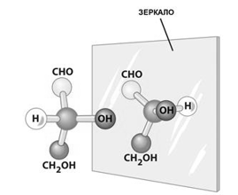Явление оптической изомерии обусловлено тем, что некоторые вещества способны изменять плоскость поляризации проходящего через них поляризованного света. Такая способность объясняется несимметричным строением молекул. Несимметричность молекул моносахаридов как раз и связана с наличием асимметрических химических групп. Такие группы содержат одинаковые атомы, но расположение этих атомов таково, что они не имеют никаких элементов симметрии. Группы атомов углеводов обладают свойством асимметричности в том случае, если к атому углерода присоединены 4 различных атома или группы. Такие две группы отличаются одна от другой так, как отличается предмет от своего зеркального отражения (рис.2).