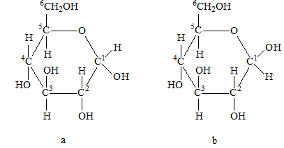 Легко запомнить, что циклическая форма монозы (рис.4), у которой полуацетальный гидроксил расположен по одну сторону с гидроксилом, определяющим принадлежность к D- или L-ряду, называется α-формой. Если же эти гидроксильные группы расположены по разную сторону, такая молекула представляет собой β-форму.