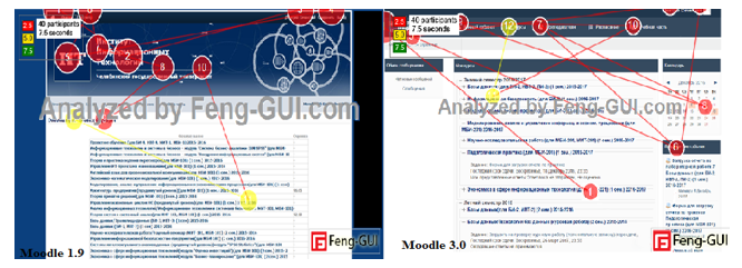 Feng-GUI расставляет приоритетно точки, на которые при загрузке страницы будет бросаться взгляд человека, на рисунке 1 слева представлено отображение в старой версии, а справа - новой. В центре страницы располагается самая нужная информация на данной странице, при модернизации СДО Moodle, удалось добиться того, чтобы взгляд пользователя изначально бросался в центр. Данное web-приложение необходимо использовать, чтобы наиболее удачно располагать элементы системы. Проведя опыт со всеми страницами старой и новой версии, удалось не только в нужном месте расположить элементы в системе, но и доказать, что модернизация системы обосновывается и техническими средствами.