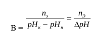 где В – буферная ёмкость, nЭ– количество моль-эквивалента сильной кислоты или щелочи, рНН – начальное значение рН ( до добавления кислоты или щелочи), рНК– конечное значение рН (после добавления кислоты или щелочи), ΔрН – изменение рН.