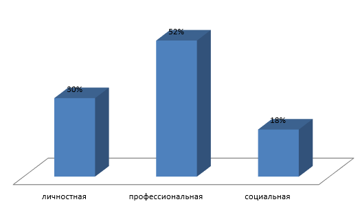 52% педагогов (больше половины испытуемых) отнесены к профессиональной самореализации, что иллюстрирует доминирование у них целей и задач, связанных с профессией, устремление к профессиональной компетенции и профессиональному самосовершенствованию.