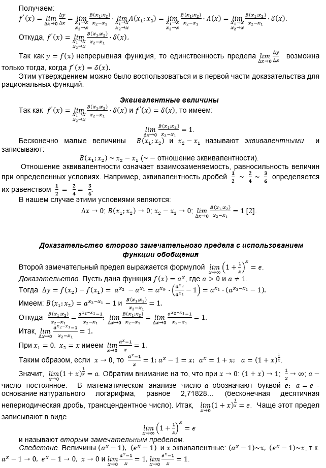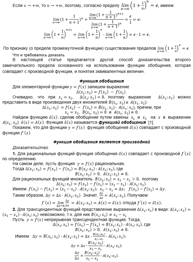 Аннотация. Рассмотрены доказательства второго замечательного предела: классическое из курса математического анализа и новое, основанное на использовании функции обобщения. Преимуществом нового доказательства является то, что оно не требует сложных математических умозаключений, а опирается на равенство функции обобщения и производной функции, а также понятие эквивалентных величин.