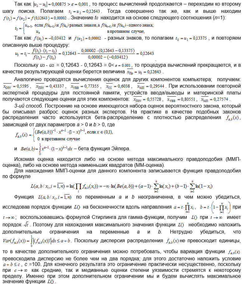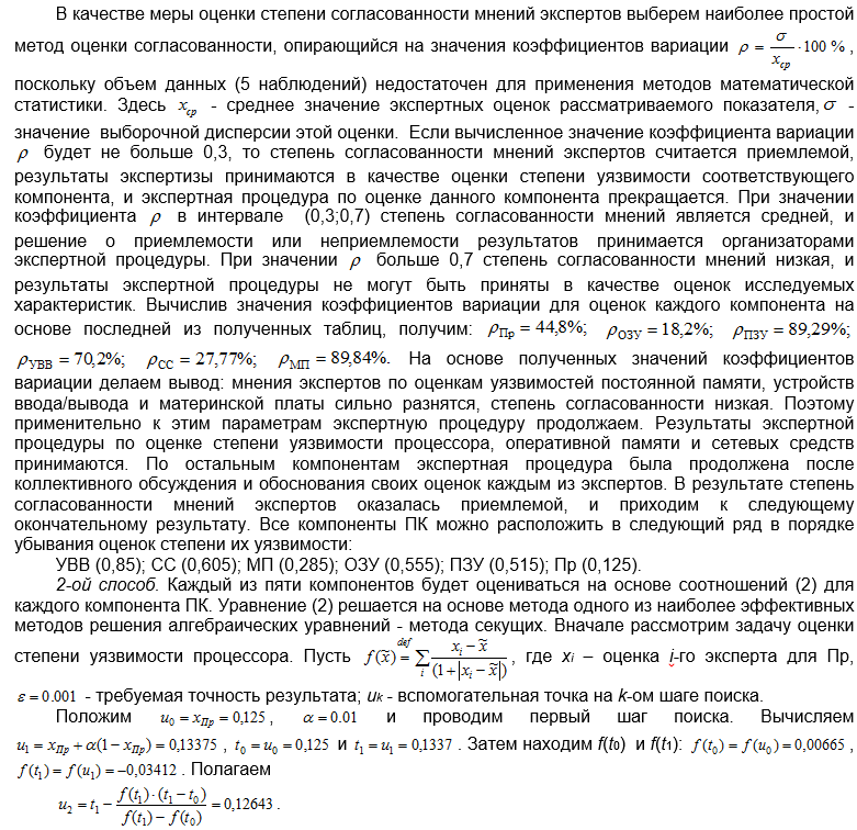 1-ый способ. В качестве результирующих оценок для каждого компонента берутся средние значения по всем экспертам (то есть средние значения по каждой строке). В результате были получены следующие результирующие оценки, которые упорядочены в порядке убывания оценок степени их уязвимости (рядом с оценкой в скобках записаны результирующие оценки их уязвимости): УВВ (0,755); СС (0,605); ОЗУ (0,555); ПЗУ (0,42); МП (0,305); Пр (0,125).