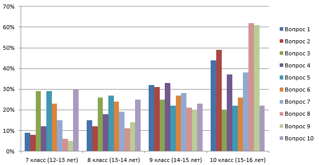 Диаграмма отражает два основных показателя: вертикальная ось - число опрошенных обучающихся, выраженное в процентном соотношении; горизонтальная ось - возрастные группы. Процентное соотношение составлялось от всей массы опрошенных в каждой возрастной группе (7-10 классы) при анализе вопроса по отдельности, что составило объективную картину исследования (рис.1).
