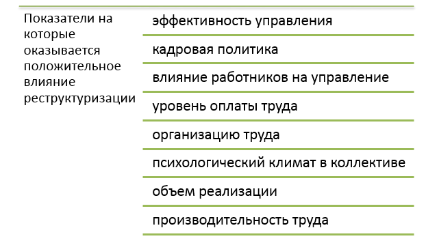 Чаще всего реструктуризация оказывает положительное влияние на следующие показатели: