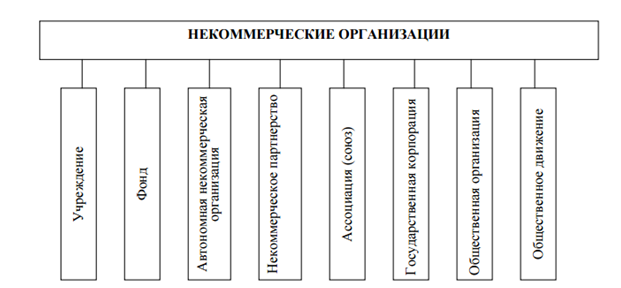 Некоммерческие организации или сокращенно НКО имеют свою специальную организационно-правовую форму (рис.1) и регулируются федеральным законом о некоммерческих организациях [2]. Такие организационно-правовые формы имеют свои особенности, влияющие на управление организации, и зависят от формирования управленческих органов, односторонней или взаимной ответственности учредителей и организации по объему имущественных прав.