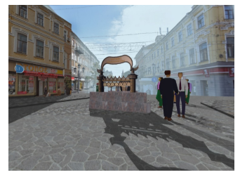 На рисунках 1 - 5 представлено макетирование с помощью современных компьютерных средств - программ Архикад и Артлантис. Сначала в программе Архикад (рис.1) исследовались различные формы памятника, угол стрелки, высота, габариты, угол наклона. Эти поиски соотносились с пропорциями человека и окружающей городской среды (шириной улицы, высотой домов) – нам хотелось, чтобы памятник «не потерялся», был соразмерен окружающему пространству городской среды и пешеходу, прогуливающемуся по пешеходной зоне и имеющему возможность рассмотреть памятник с близкого расстояния. Сказанное отображено на рис. 6 – 8.