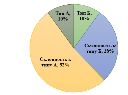 Также из рисунка 1 можно установить, что 10 % опрошенных обладают типом стрессоустойчивости А. Люди, относящиеся к данному типу, обладают низкой стрессоустойчивостью, характеризуются стремлением к конкуренции, достижению цели, обычно бывают не удовлетворены собой и обстоятельствами и начинают рваться к новой цели. Часто они проявляют агрессивность, нетерпеливость, гиперактивность, у них быстрая речь, постоянное напряжение лицевой мускулатуры.