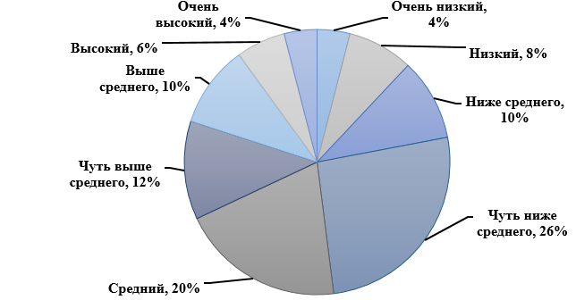Также установлено, что 26 % респондентов обладают чуть ниже среднего уровнем устойчивости. У людей с данным типом устойчивости существует разработанный ими защитный механизм от сильных потрясений, который включается при неблагоприятных условиях, но не всегда оберегающий их от стрессовой нагрузки.