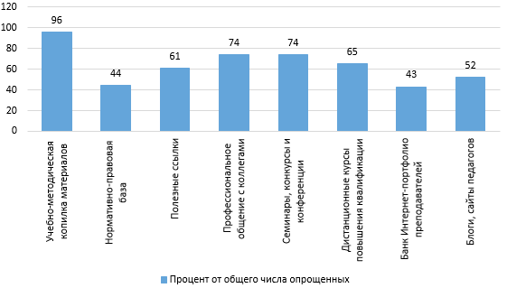 74 % опрошенных респондентов зарегистрированы в сетевых профессиональных сообществах, 52 % принимают участие в сетевых конкурсах. 65 % от общего числа опрошенных используют в своей работе методические материалы, размещенные на сайтах сообщества.