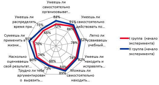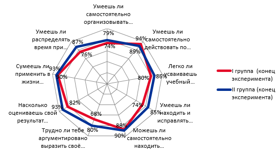 На уроках с использованием интерактивных методов формирование умений, обеспечивающих эффективность познавательной самостоятельной деятельности, происходит несколько результативнее. Если взять средний процент по параметрам самостоятельности планирования своей деятельности при использовании интерактивных методов обучения, то на начало эксперимента – 78%, а на конец – 82%. Умение работать в группе также формируется более результативно: Ӏ экспериментальная группа на начало эксперимента – 74%, на конец – 82%; ӀӀ экспериментальная группа на начало – 80 %, на конец – 93%. Преподавание уроков с использованием интерактивных методов обучения, позволяет учащимся грамотно распределять время в течение урока: Ӏ экспериментальная группа на начало эксперимента – 66%, на конец – 76%; ӀӀ экспериментальная группа на начало – 73%, на конец – 87%.