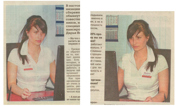 В качестве примеров можно привести следующие. На рис. 1 представлены фрагменты рекламных макетов с одной фотографией из двух разных газет. Левое изображение является зеркальной копией. Это видно по цифрам на календаре и по значку сотрудницы. Очевидно, что из компоновочных соображений дизайнер трансформировал фотографию, чтобы вписаться в левую часть макета.
