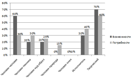 По анкете "Ориентация" (Рисунок 2) получены данные, которые говорят о том, что возможности и потребности волонтеров совпадают далеко не везде. В сфере человек-человек преобладают возможности у самого большого числа человек (8), в сфере человек-техника больше потребностей у 4 человек, в сферах человек-художественный образ (3) и человек-природа (2), исполнителями желают быть 5 волонтеров, а работать в творческой сфере могут - 9.