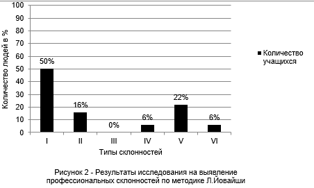 Затем проводилось исследование профессиональных склонностей с помощью опросника профессиональных склонностей Л.Йовайши (в модификации Г.В. Резапкиной). Результаты исследования представлены на рисунке 2.