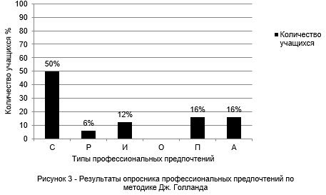 Третьим по плану был проведен опросник профессиональных предпочтений Дж.Холланда. Результаты исследования представлены на рисунке 3.