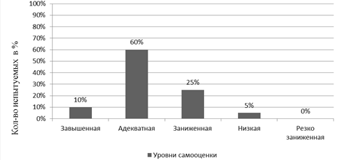 Адекватная самооценка у большинства учащихся, она составляет 60% (13чел) показали нормальный уровень развития самооценки. У учащихся сформировано положительное отношение к себе. Они умеют оценивать себя и свою деятельность, и это считается нормой.
